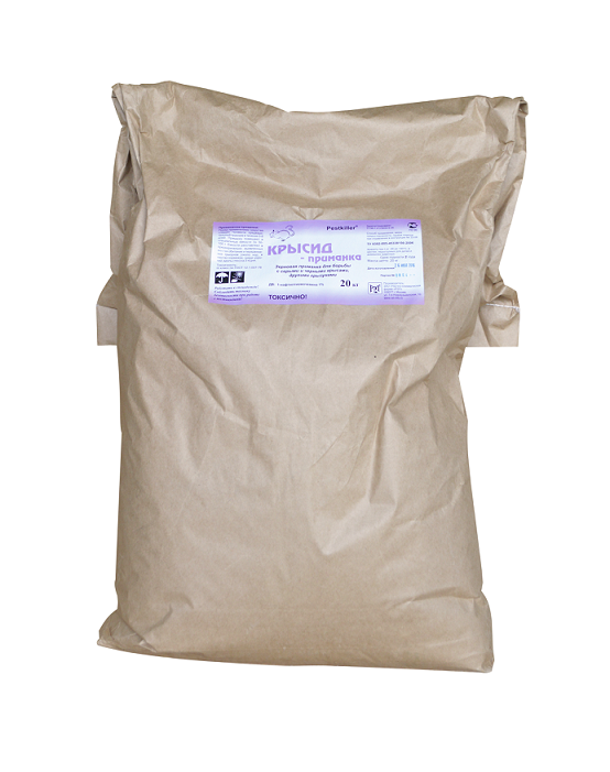 Средство «КРЫСИД-ПРИМАНКА» (далее – средство) представляет собой готовую к применению зерновую отравленную приманку серого цвета на основе очищенного зерна или круп, содержащую в качестве действующего вещества (ДВ) 1-(1-Нафтил)-2-тиомочевину – (крысид) в количестве 1,0%, вводимый в составе родентицидного концентрата «Крысид-гель». Средство предназначено для борьбы с серыми и черными крысами профессиональным контингентом в практике медицинской дератизации и населением в быту. Средство применяют в очагах природно-очаговых инфекций, на застроенных и не застроенных частях населенных пунктов, включая жилые помещения, пищевые, детские ( в отсутствие детей) и лечебные объекты. Упаковка: в четырехслойные бумажные мешки, обеспечивающие сохранность продукции. Масса нетто средства в мешке от 10 до 30 кг.