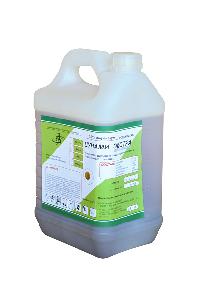 Родентицидное средство «Цунами экстра концентрат» представляет собой концентрат в виде раствора переменной вязкости (гликолевого или маслянного или геля) или порошка на основе крахмала (талька) от зеленого до черно-зеленого цвета и предназначенного для приготовления родентицидных приманок. В состав средства входит действующее вещество (ДВ) дифенакум в концентрации 025%. Помимо ДВ в состав средства входят вспомогательные вещества - битрекс (горечь), краситель, антиоксидант, стабилизатор, гелеобразователь и наполнители - растительное масло или триэтиленгликоль, или крахмал кукурузный, или талькомагнезит. Приманка обладает высокой родентицидной активностью в отношении серых крыс, домовых мышей, обыкновенных полевок. Родентицидное средство «Цунами экстра концентрат» предназначено для приготовления приманок с целью борьбы с фызунами - серыми (черными) крысами, домовыми (лесными) мышами, обыкновенными (лесными, водяными) полевками. Приманки применяют на объектах различных категорий на застроенных и незастроенных территориях населенных пунктов, включая жилые, пищевые, детские, лечебные (в местах недоступных детям и больным или в периоды их отсутствия), нежилые сухие и влажные помещения, подземные сооружения, подвалы, погреба, норы, природные очаги инфекций, специалисты организаций, занимающихся дезинфекционной деятельностью.